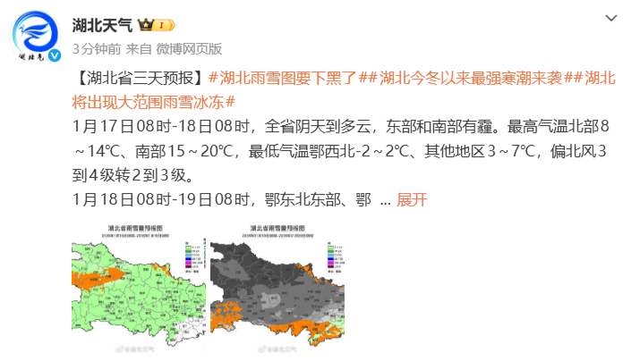 据湖北气象,1月18日晚至21日,湖北将遭遇今冬以来最强寒潮和大范围雨雪冰冻天气,致灾风险高。